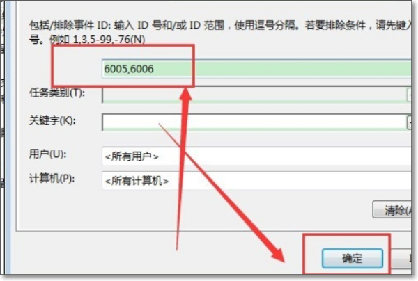 6、打开刷选当前日志窗口之后,我们在ID栏那里输入“6005,6006”,因为6005是代表开机,6006是代表关机,然后点击底下的“确定”,如图所示。