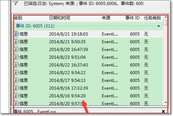 6. 此时筛选的结果就是该电脑所有的开机事件,系统已经为我们倒休排列好了,只需查看对应的时间即可得到答案。