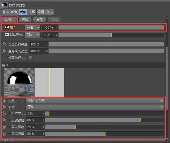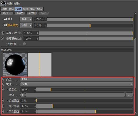 反射项高光类型选择GGX,衰减为金属,注意调整数值