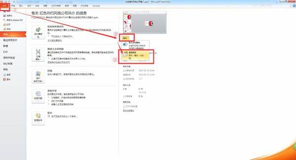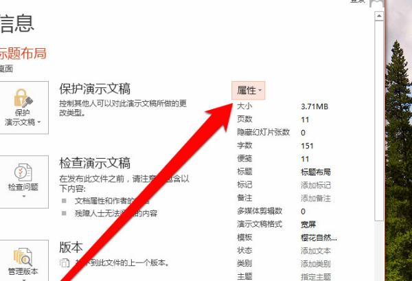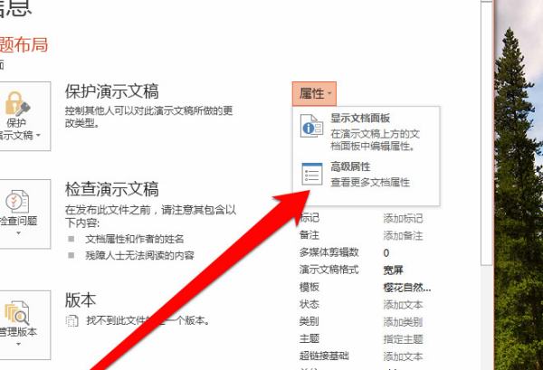 打开PPT后点击“文件”菜单,最右边有个“属性▼”按钮,点击打开下拉菜单,选择“高级属性”(如下图)