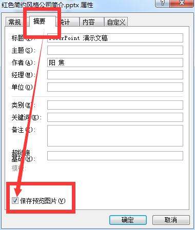 2. 在打开的对话框中选择“摘要”选项卡,在最下边有个“保存预览图片”选项,把它勾选上,点击确定。如下图
