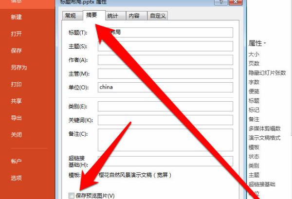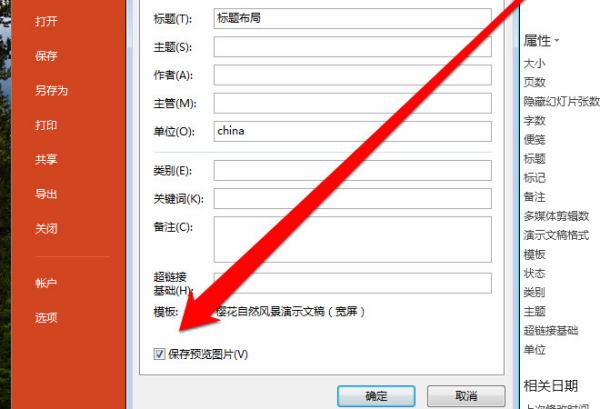5、在PPT属性界面,最下方有一个保存预览图标选型进行勾选,勾选完成后,点击确定按钮。