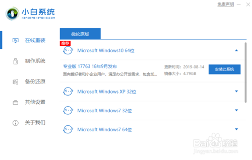 打开小白一键重装系统软件后,选择在线重装,选择win10 64位系统,点击安装此系统。