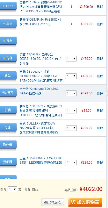 给你选了三星24寸显示器,从任何角度,都比你那个AOC渣显强,电源选的世界一线品牌台达铜牌级别电源,秒飞你个翔一般的电源