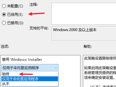 6、随后回到windows installer页面里,选择并打开禁止用户安装选项。