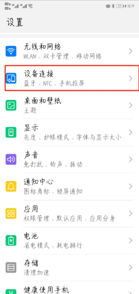 2、接着在设置选项栏向下滑动,找到“设备连接”选项,并点击进入。