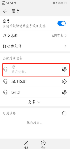 6、打开的蓝牙会自动搜索附件蓝牙设备,在“已配对设备”或者“可用设备”处寻找用户的蓝牙耳机名称,最后点击该名称即可连接,例如图中点击的是“唐”,等待一会儿即可连接成功。