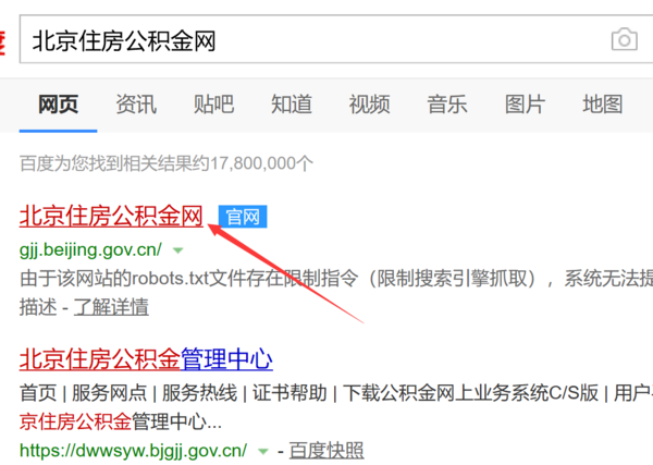 1、在电脑上的浏览器中搜索所在地的公积金官网,以北京为例,搜索”北京住房公积金网“,在搜索结果中点击”北京住房公积金网官网“进入。