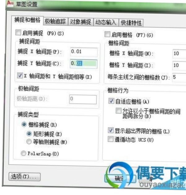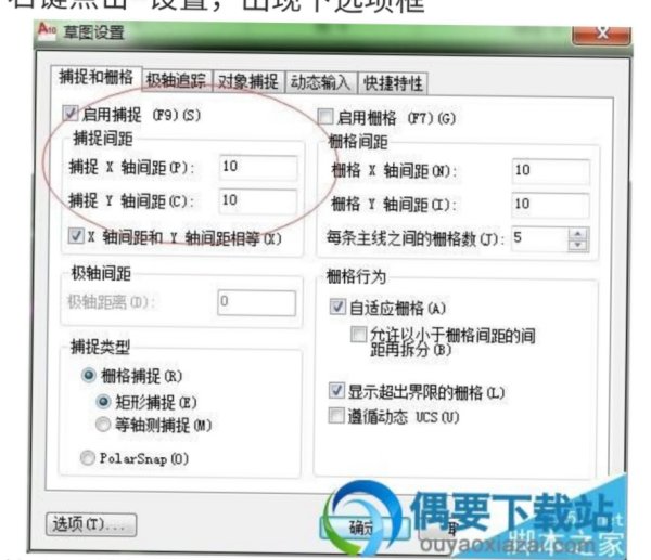 3、将启用捕捉选项不选择,最好将下间距调小,确定就能了.如图