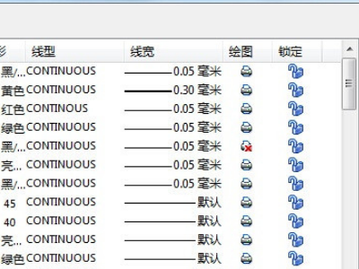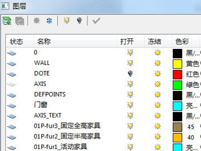 3、在图层窗口中会显示当前cad文件的所有图层,图层信息包括状态、名称、打开、冻结、色彩、线型、线宽、绘图、锁定。