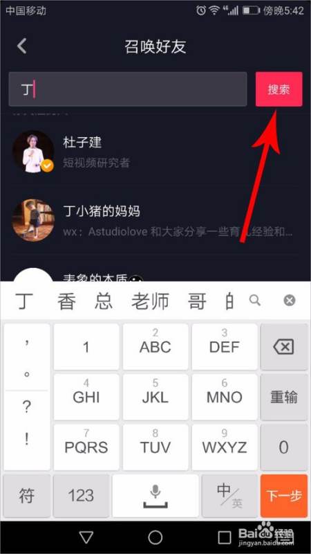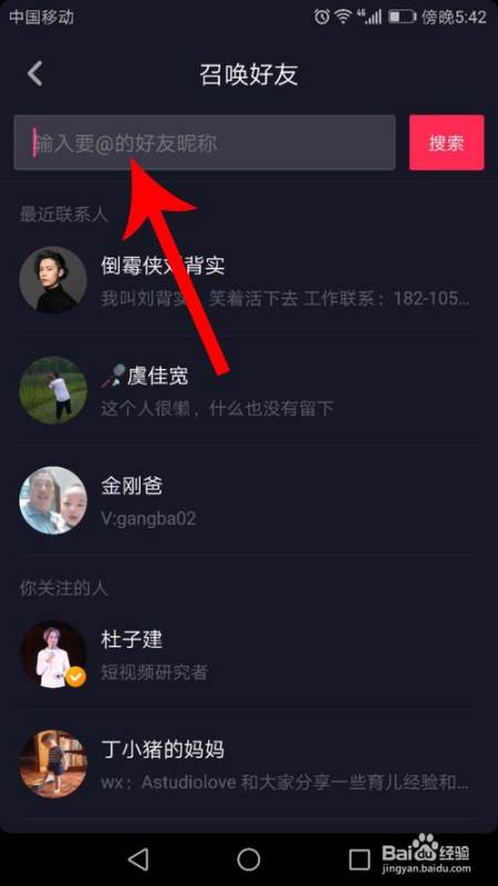接着在输入框中输入想要艾特@的昵称,点击搜索后,在搜索结果中找到对方昵称