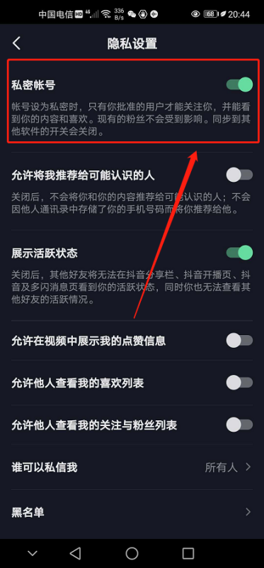 5、在隐私设置中,将私密账号的开关旋钮关闭即可完成操作。