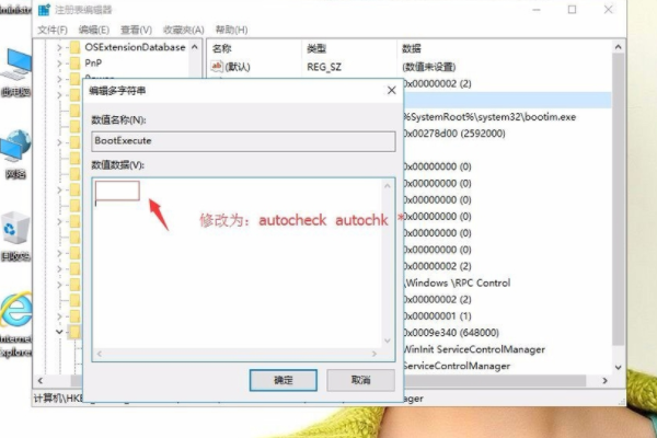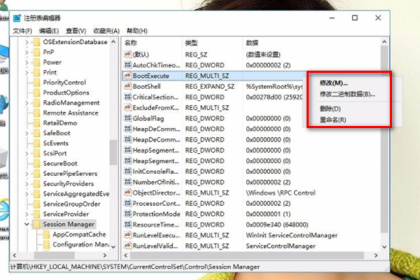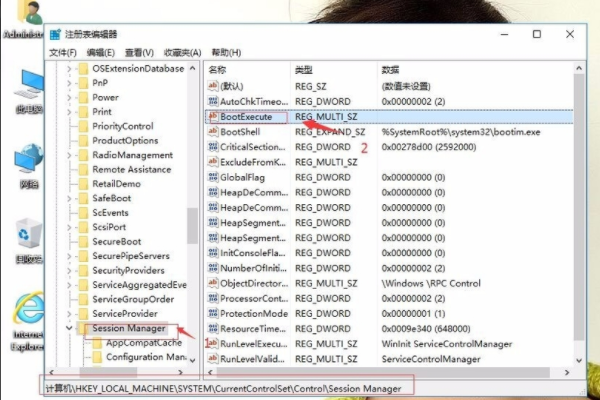 3、然后我们在注册表编辑器中展开定位[HKEY_LOCAL_MACHINE/SYSTEM/CurrentControlSet/Control/Session Manager]。在右侧,找到BootExecute。