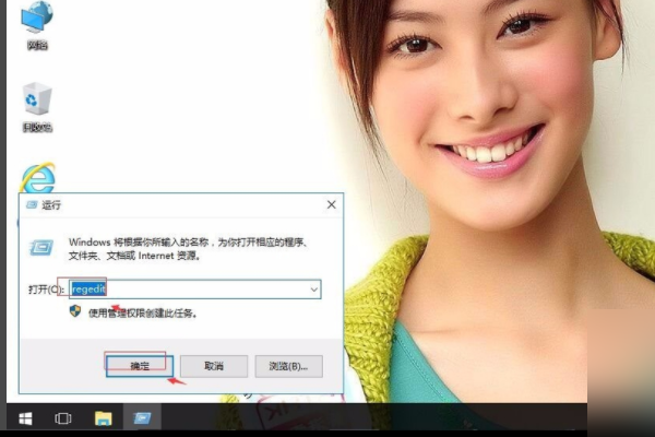 2、然后我们在运行输入框里输入regedit,再点击确定。