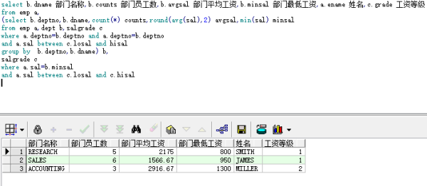 (select b.deptno,b.dname,count(*) counts,round(avg(sal),2) avgsal,min(sal) minsal