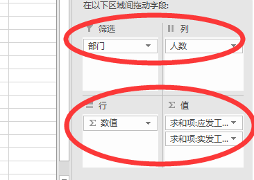 2、然后在打开的设置窗口将部门拖入“筛选”,将人数拖入“列”,将“应发工资和实发工资”拖入“值”。