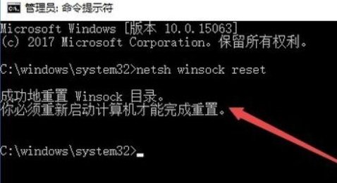 3、回车后 运行上面的命令,一会就会提示重置Winsock目录成功。