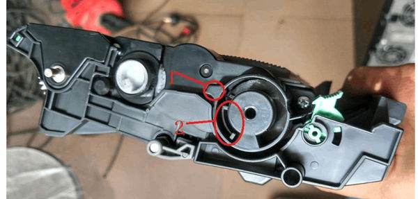 拿出粉盒,用改锥拧开左边的两个螺丝,打开盖子,里面有一个黑色的齿轮,齿轮正时针转70度。黑色齿轮左边是一个白色的齿轮,白色齿轮上有多出来一小块,旋转白色齿轮,多出来的一块对着旁边的黑色的小柱子。清零完成。