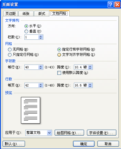 3、选择文档网格选项卡,选择指定行和字符网格,在每行输入框中输入40,每页的输入框中输入42即可,如图所示。