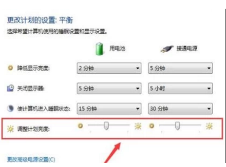 6、在弹出的窗口中,拉动【调整计划亮度】光标,即可调节电脑的亮度。