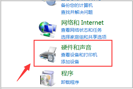 2、在弹出的【控制面板】窗口中,选择【硬件和声音】。