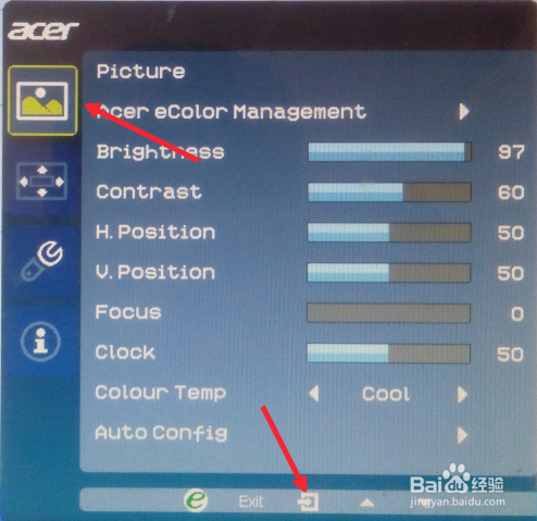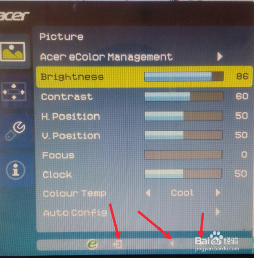 1.按屏幕上的“MENU”键(有时是“皿”形或“目”形图标),可以呼出显示屏设置菜单。找到“SETUP"或"OSD SETUP“一项,进入后,找到"Language",即可设置语言,设置为简体中文。然后返回设置菜单的初始界面,找到相应选项进行调节。 2.显示器上的按钮,你找一个类似于小太阳的标记,这个按钮是调节亮度的;找一个黑白各半的圆形图标,这个按钮是调节对比度的。有些显示器则分别为向左箭头、向右箭头;有些显示器则分别为向上箭头、向下箭头;也有些显示器是加号、减号。——呼出调节菜单后,同样用这两个键调整亮度和对比度的数值大小。acer怎么调节屏幕亮度(台式机显示器)