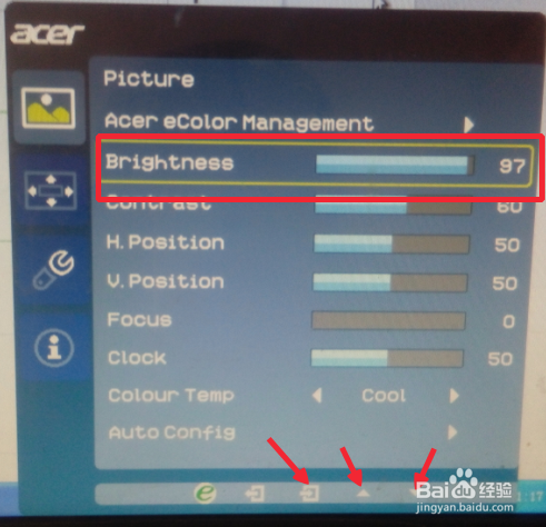 进去之后在下方有上下调节的按钮,把黄色的框圈到Brightness选项,这个就是亮度了,选择进入