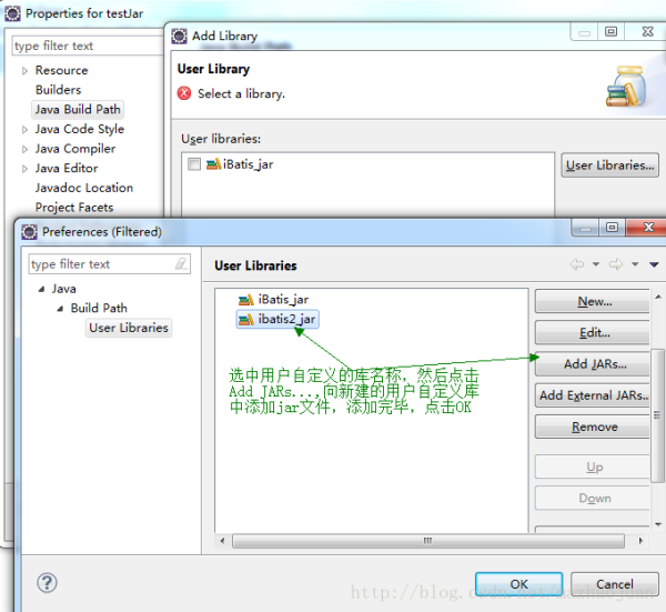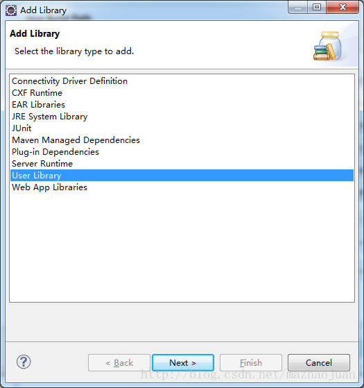 右键项目属性,选择Property,在弹出的对话框左侧列表中选择Java Build Path,弹出如上图所示的对话框,这里选择"Add Library",弹出如下图所示对话框,选择"User Library",然后选择—》Next