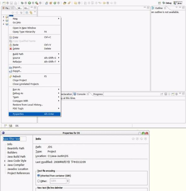 1.右击工程的根目录,点击Properties进入Properties。或者选中工程根目录,按Alt-Enter即可。
