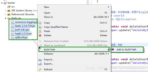 选中需要添加到项目中的jar包,右键选择"Build PathàAdd to Build Path",这样Jar包就成功导入到项目中了