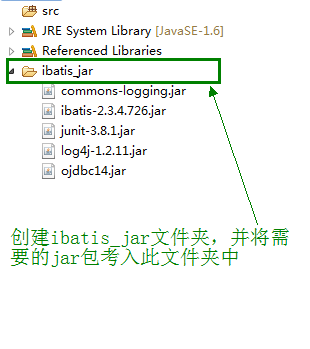 在项目中,创建新的文件夹(eg:ibatis_jar),如下图所示,本示例中创建了ibatis_jar文件夹,并将项目开发需要的第三方的jar包拷贝到该文件夹中。