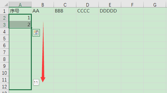 步骤五:下拉到完成序号填写的单元格,松开鼠标左键,即可完成序号自动递增。