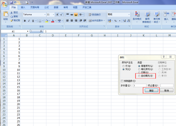 5.在出现的“序列”对话框中,“类型”一栏下,选择“自动填充”,再点击“确定”即可。