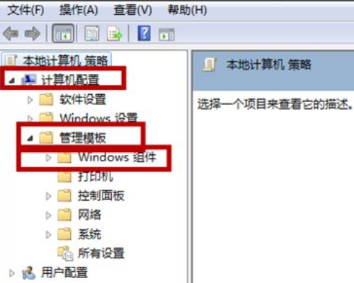 之后我们依次点击左侧选项中的”计算机配置““管理模块”“Windows组件",如图所示。
