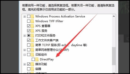 4、这时打开Windows功能窗口,找到旧版组件一项,展开后选中下面的DirectPlay项。如下图所示。