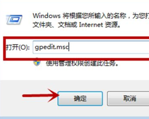 之后我们在运行的打开当中,输入“gpedit.msc,点击确定即可,如图所示。
