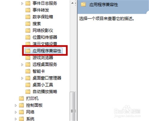5、之后我们找到”应用程序兼容性“点击进入,在左侧即可打开里面的选项,如图所示。
