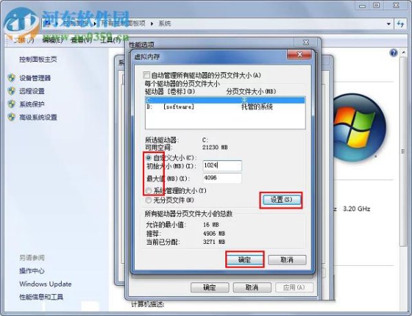 也就是虚拟内存的设置界面,我们在修改虚拟内存大小的时候需要注意一下空间的大小,设置的最大值最好在物理内存的1.5-3倍以内,最好不要超过3倍!设置好之后使用“设置”-“确定”按钮进行保存即可!