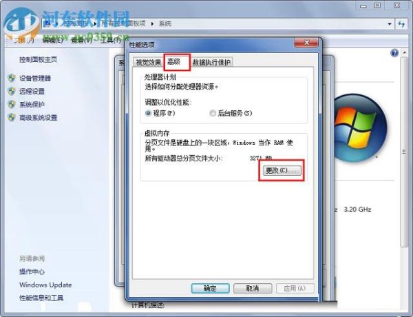 随后将性能选项中的选框卡修改为:高级一栏中去,修改之后使用下方的“更改”按钮进入我们最重要的设置界面!