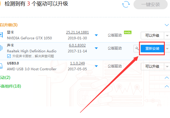 四、最后点击“重新安装”驱动,安装完成后即可解决音频管理器打不开的情况。