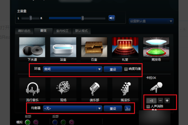 4、然后我们进行音效设置,音效主要设置环境和均衡器,这里环境设置为房间,均衡器设置为无,人声消除一般不勾选,卡拉ok设置为0。
