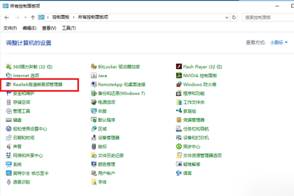 1、首先我们在win10系统中打开控制面板,以小图标的方式查看,点击Realtek高清晰音频管理器。