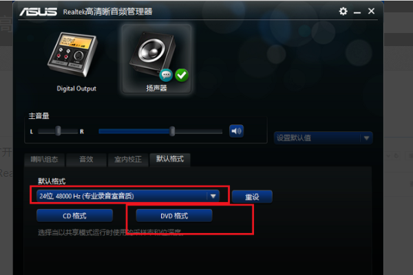 6、然后我们进行格式设置,选择DVD格式,这里设置的是24位,48000HZ,这样就设置完成了,设置音频管理器可以拥有更好的音质效果。