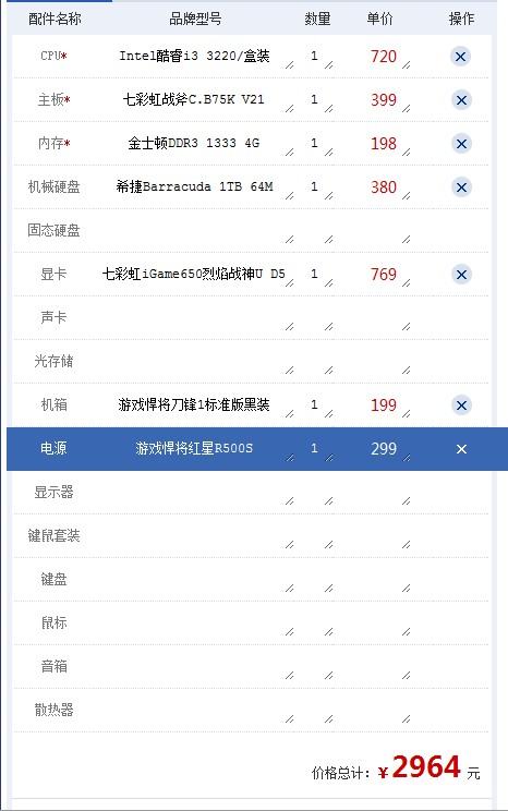 说实话,3000元配主机很难保证性能,所以建议预算稍微增加15%,另外,春节期间价格比较高,很多产品缺货严重,建议推迟到3月底购买。CPU AMD Athlon64 3000 754针(盒装三年保) 910 主板 顶星 K8N4X 588内存 宇瞻 512M DDR400 CL2.5 终身质保 310 硬盘 日立 HDS728080PLA380 449 显卡 影驰 GF6600 PCI-E 256MB DDR2高清版 699 声卡 主板集成 网卡 主板集成 光驱 台电 女涡DVD-RW 299 鼠标 键盘 双飞燕光学套装 85 机箱 电源 大水牛宇宙系列A0318 299能玩转网游的主机配置3000以内能多开