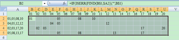 =IF(ISERR(FIND(B$1,$A2)),"",B$1)