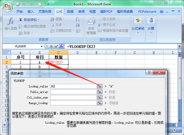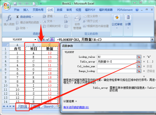 5、函数第一行选择作为对应条件的数据,这里选取所对应的项目
