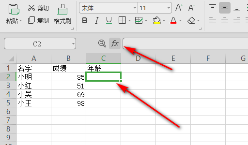 3、选中表格1中年龄下方的单元格,然后单击插入函数。