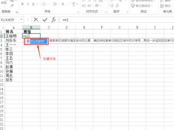 3、在单元格中输入“=vl”,然后会自动提示出VLOOKUP函数,双击蓝色的函数部分。