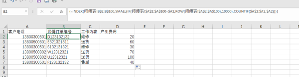 =INDEX(师傅表!B$2:B$100,SMALL(IF(师傅表!$A$2:$A$100=$A2,ROW(师傅表!$A$2:$A$100),10000),COUNTIF($A$2:$A2,$A2)))