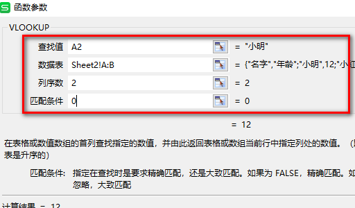 5、在VLOOKUP界面中,查找值选中小明所在的单元格,数据表选中表格2中所有数据,列序表填2,因为年龄在表格2中的第2列,匹配条件填0就可以了。